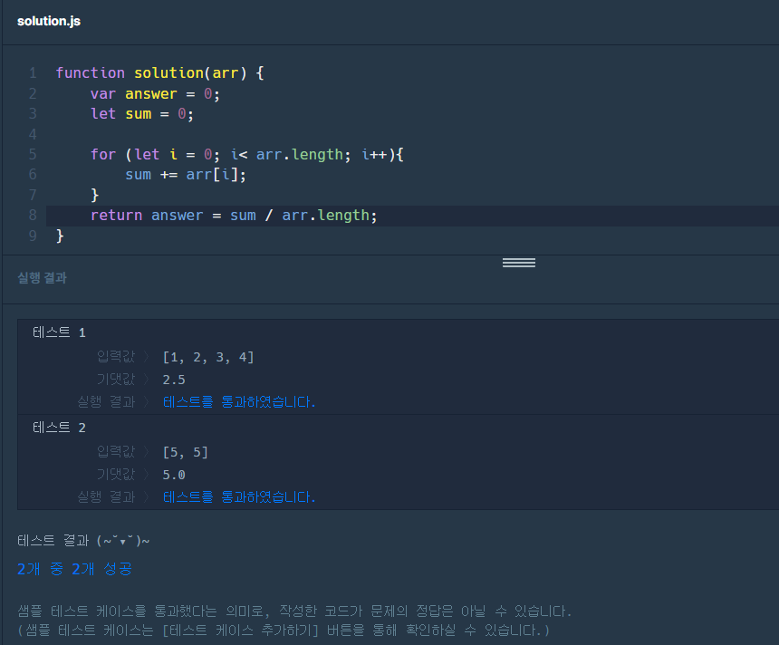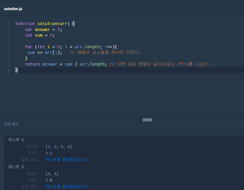 배열 내 평균값을 구하는 함수라서 배열들의 수를 더해주고 배열의 길이만큼 나눠주면 됬었기에 사실상 10일차 문제랑 비슷하다고 생각해서 풀었다.