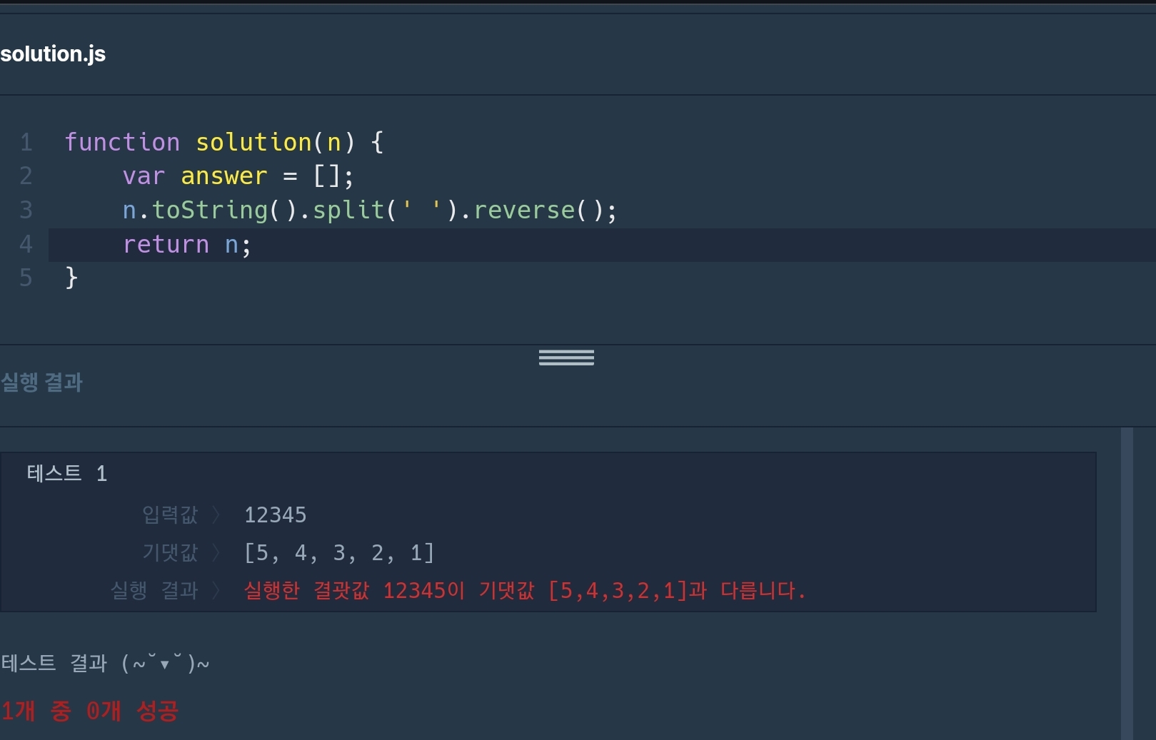 다시보니 입력되는 n값 형식이 그냥 12345 요런 형식이었어서, 컴퓨터 입장에서는 배열으로 나열해야 함을 인지못했을 것 같다.