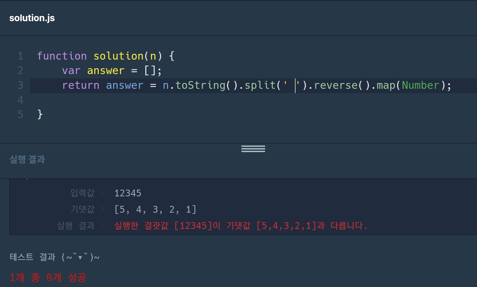 split(' ') ('') 요 따옴표 사이에 띄어쓰기 하나만 추가했을 뿐인데 바로 중간에서 코드를 인식하지 못해서 뒤에 함수까지 연산이 이루어지지 않아 오답으로 나왔던 것이다.