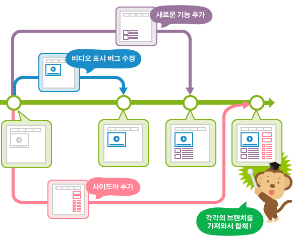 - 새 브랜치를 만들면 기존에 저장한 파일을 master 브랜치에 그대로 유지하면서 기존 파일 내용을 수정하고나 새로운 기능을 구현할 파일을 만들 수 있다.