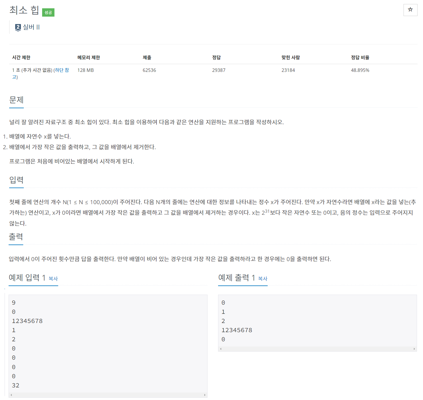 if(heap.size() == 1) return 0; //삭제시 값이 남아있지않다면 0을 반환한다.