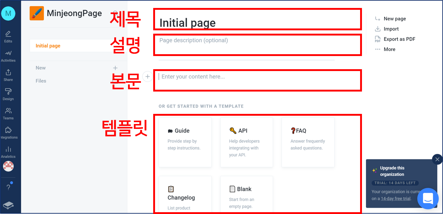 보시는 거와 같이 제목, 설명, 본문, 템플릿선택 으로 이루어져 있습니다.