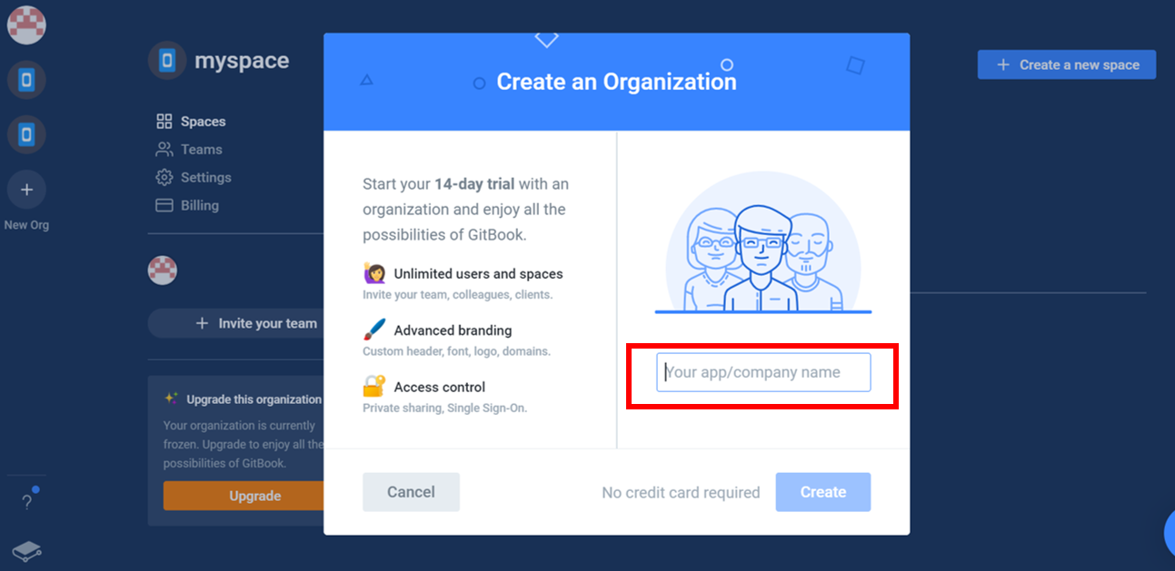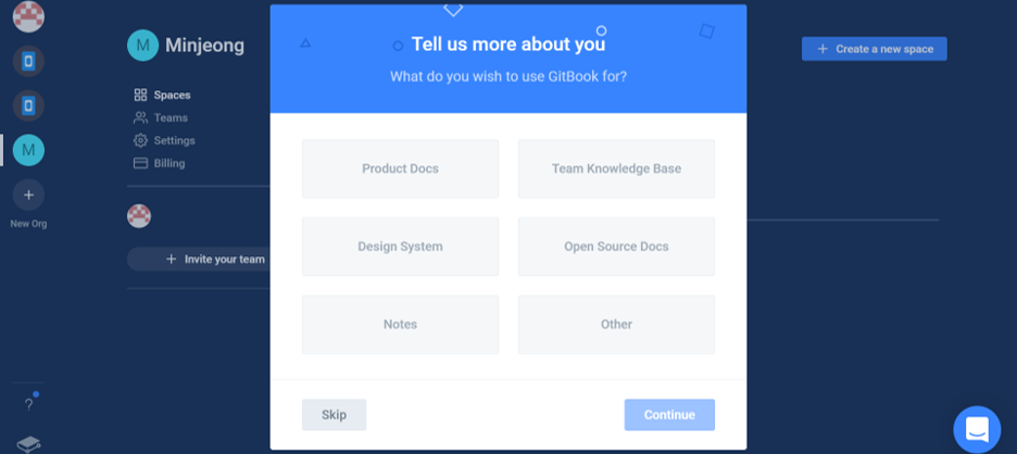기관인 Organization을 생성합니다. 나중에 만든 gitbook의 url에 organization의 이름이 포함됩니다.