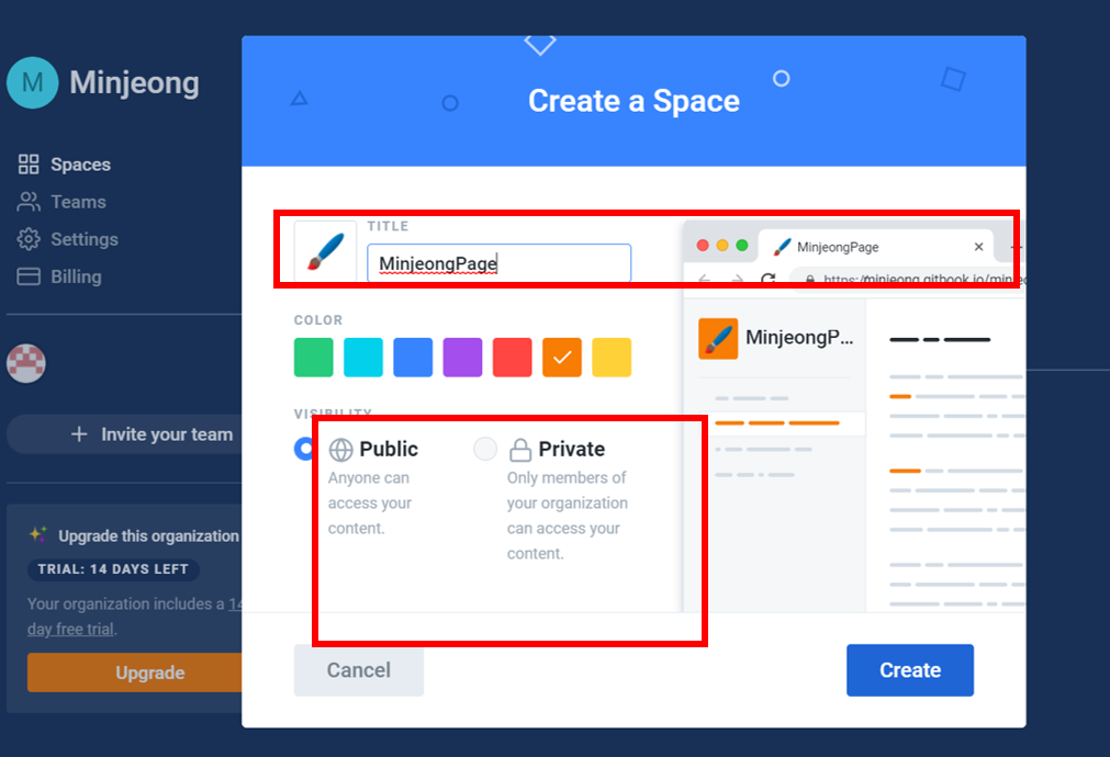 타이틀과 공개범위를 설정합니다. 타이틀은 나중에 생성된 자신의 gitbook의 타이틀이 되고 url에 포함됩니다.