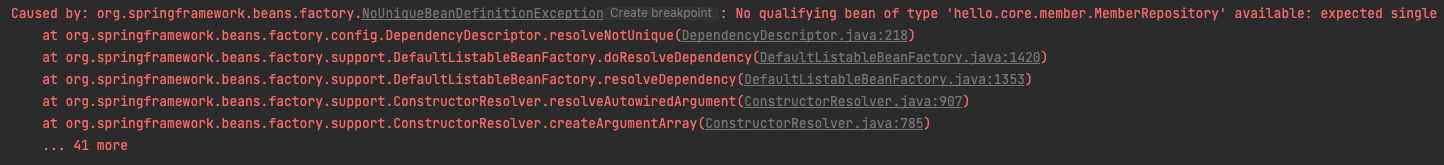 MemberRepository 타입의 빈이 memoryMemberRepository, memberRepository 두 개가 존재해서 생긴 오류이다.