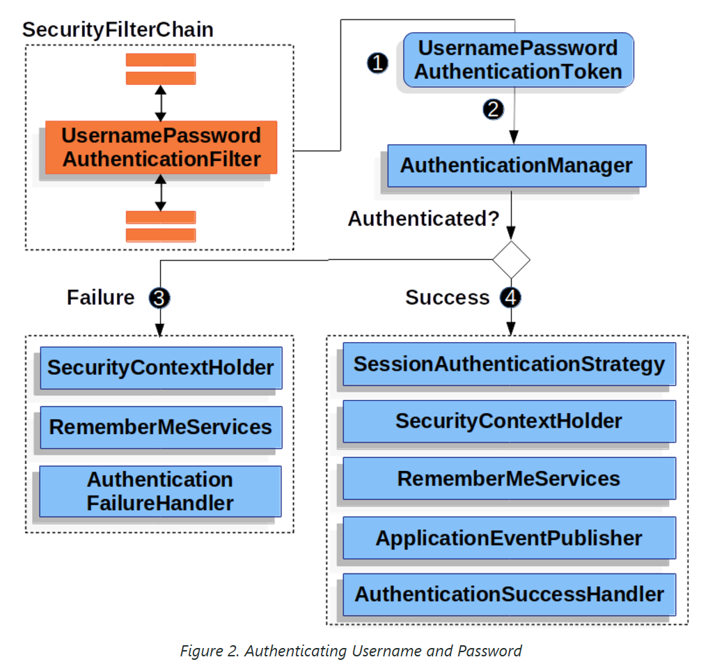 사용자 이름과 비밀번호가 제출되면, UsernamePasswordAuthenticationFilter가 사용자 이름과 비밀번호를 인증합니다. UsernamePasswordAuthenticationFilter는 AbstractAuthenticationProcessingFilter를 확장하므로, 아래의 다이어그램은 매우 유사하게 보일 것입니다.