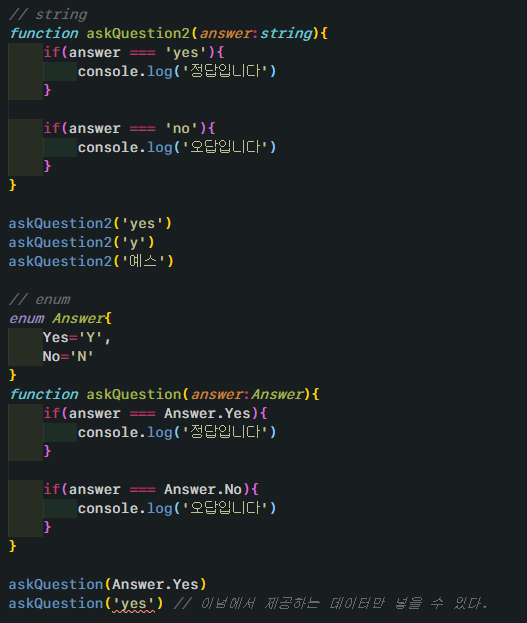 위와 같이 string type으로 타입을 정의할 경우 yes,no가 아닌 다른 값도 들어와서 예외처리를 할 수 없다. Enum type을 사용하면 지정한 값이 아닌 다른 값에 대해 미리 에러가 발생한다.