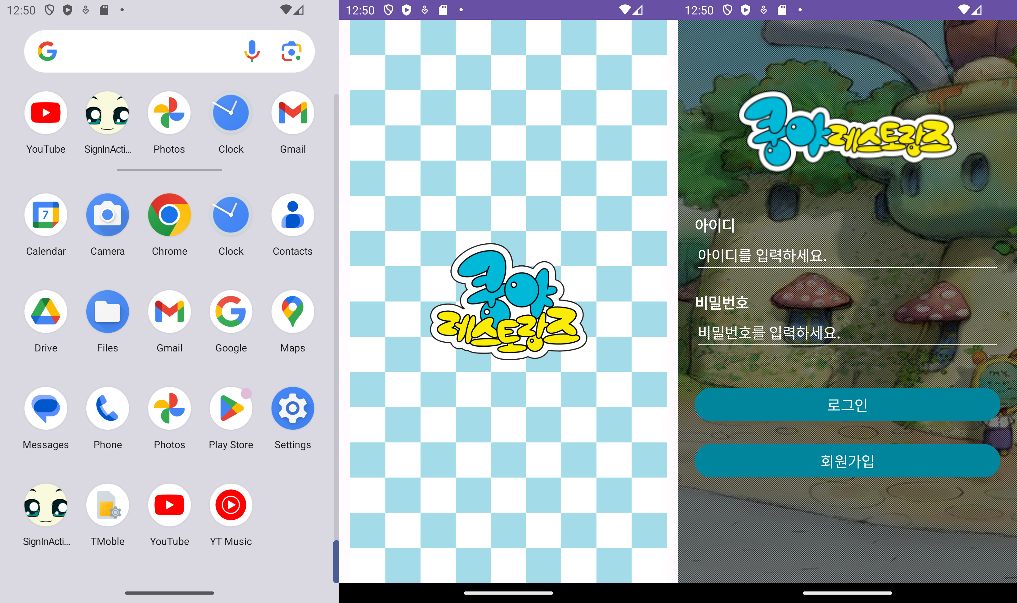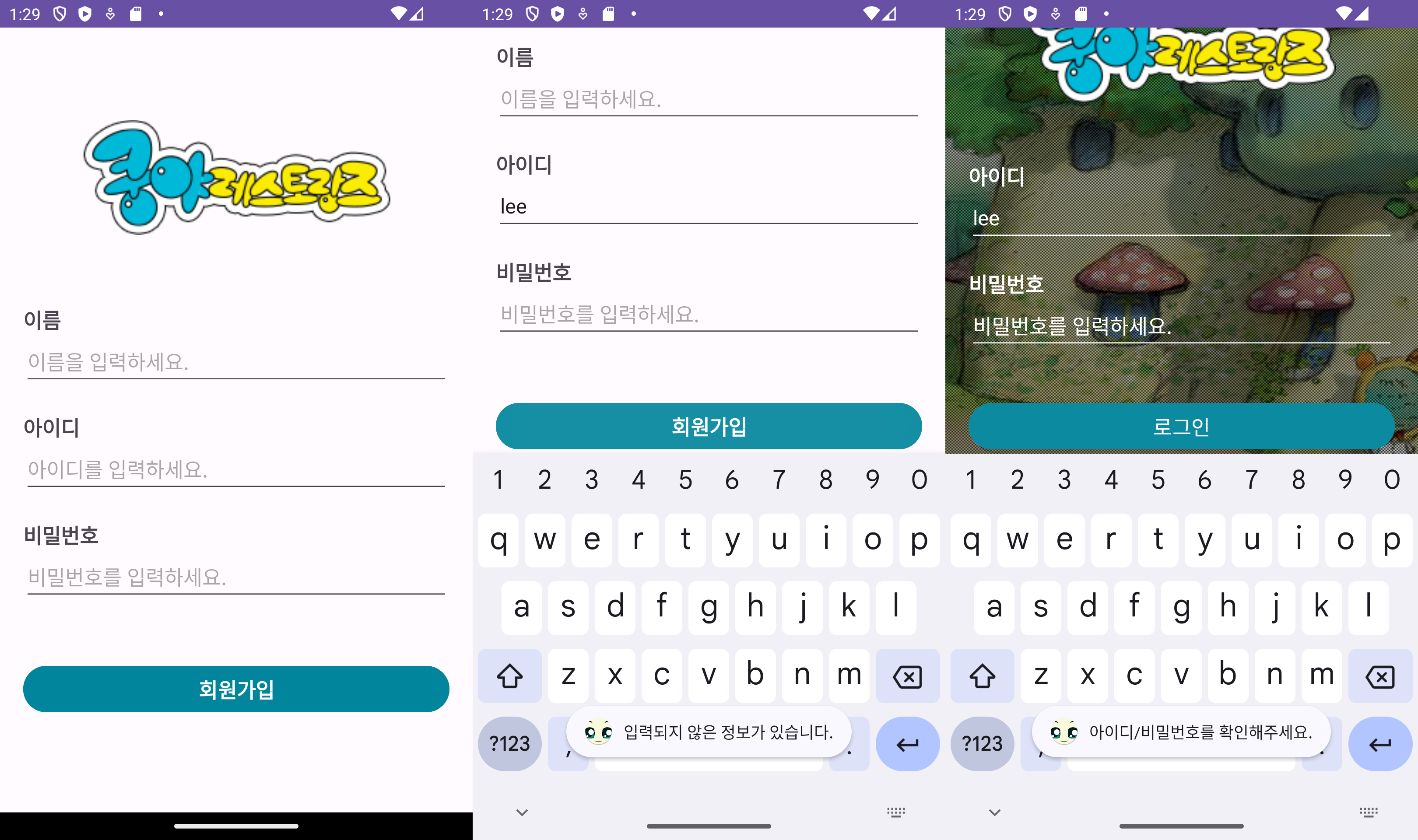 회원가입, 로그인 페이지에 모든 텍스트가 입력되지 않으면 화면 전환이 되지 않으며, 정보를 모두 입력해 달라는 토스트 메세지가 뜹니다. 회원가입시 작성한 id와 password데이터를 로그인 페이지에 전달 하는 로직을 추가하였습니다.