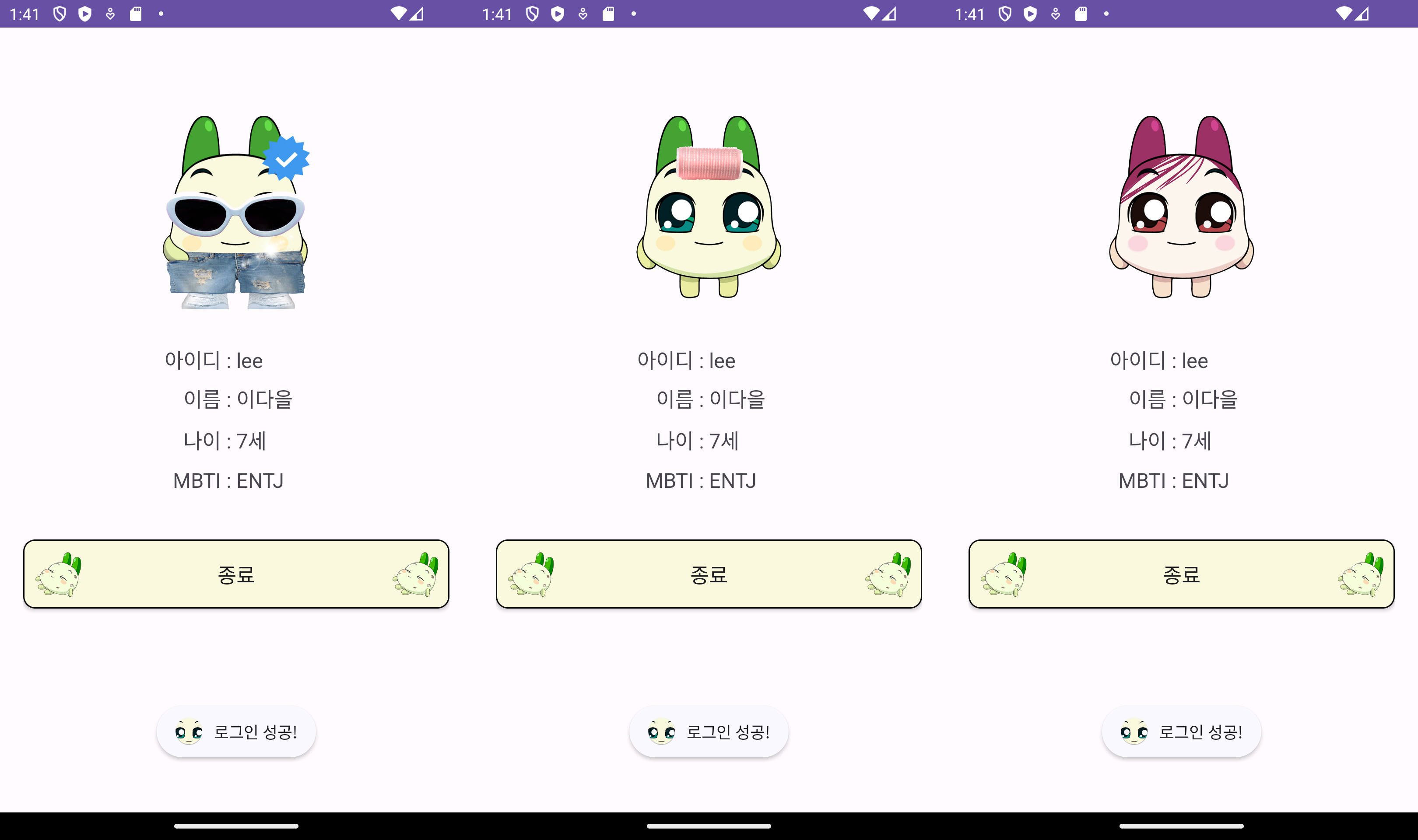 회원가입을 성공적으로 마치면 아이디, 비밀번호 정보가 그대로 로그인 페이지로 넘어오기 때문에 로그인 버튼만 눌러 로그인을 할 수 있습니다. 로그인을 하면 다양한 프로필 이미지가 랜덤으로 반겨주네요! 로그인 화면에서 입력한 id도 그대로 반영이 되는것을 확인할 수 있습니다.