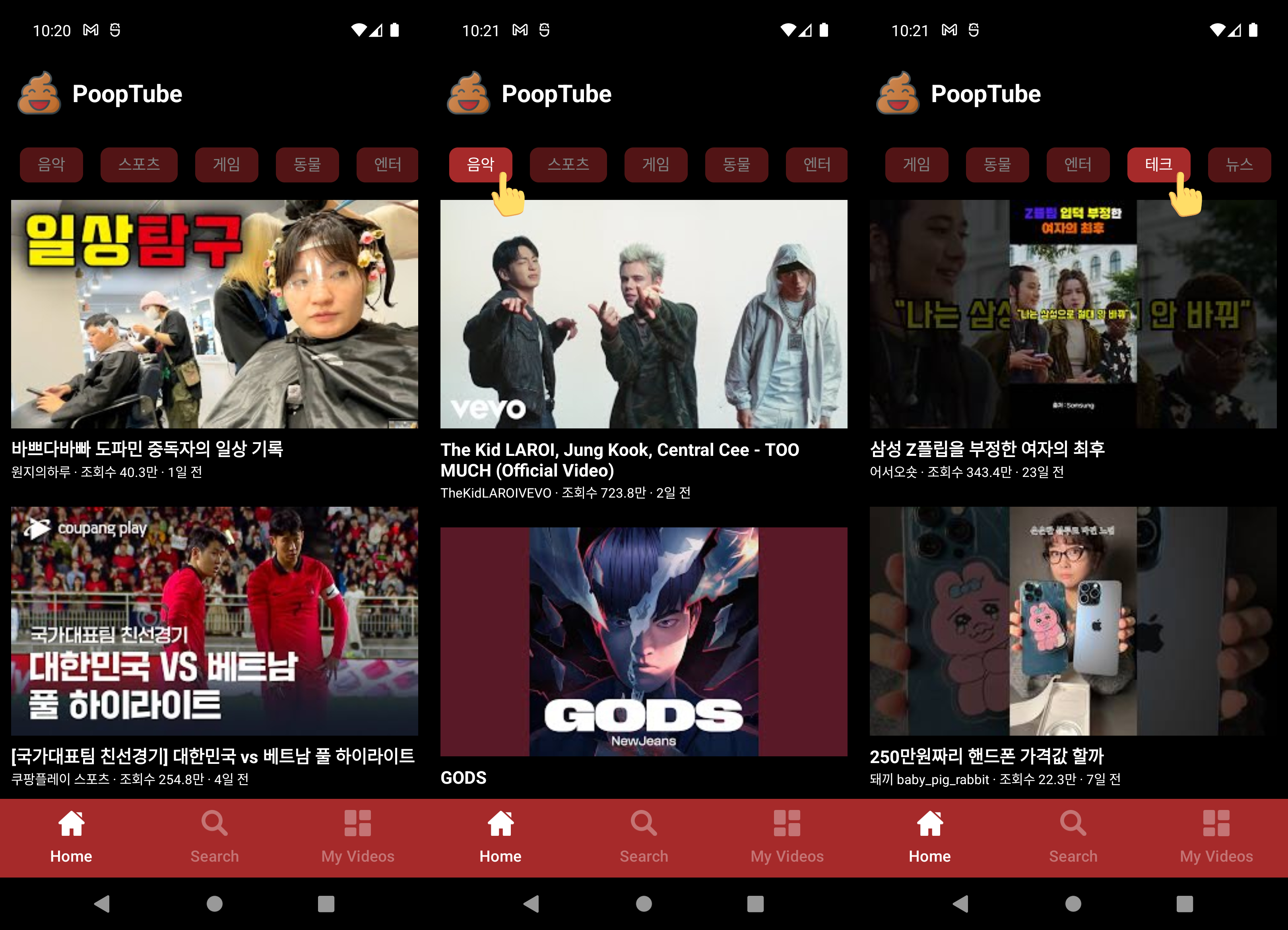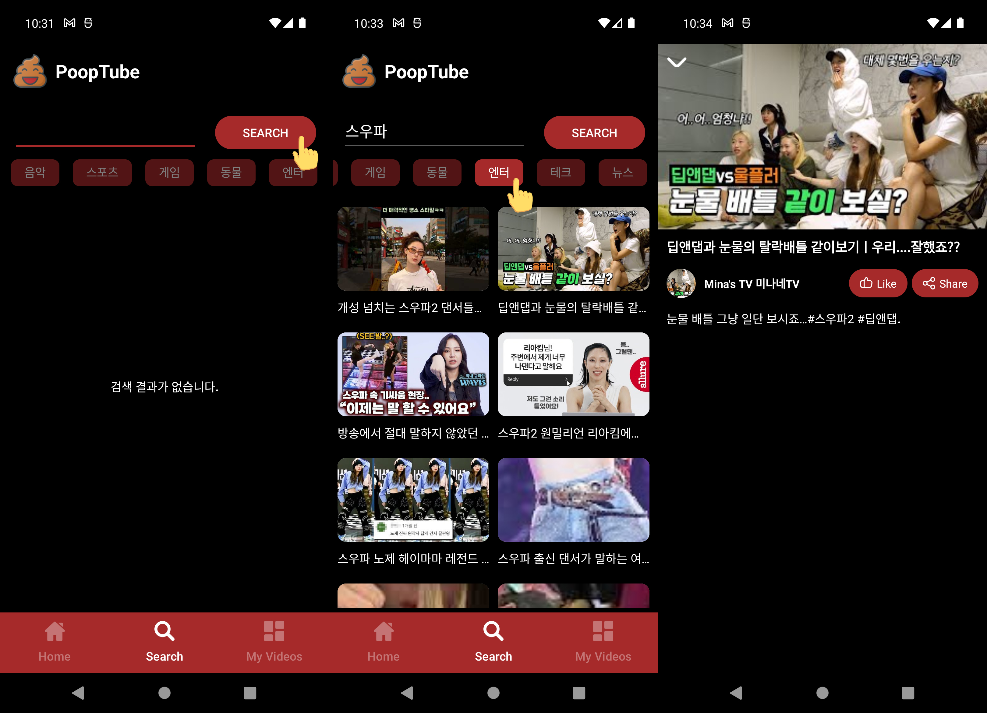 입니다. 팀명의 '응가(Poop)'와 미디어를 보며 재밌어서 '풉풉' 웃는 모습의 이중적인 의미를 담은 컨셉으로, YouTube Data API v3을 이용하여 가장 인기있는 동영상과 카테고리별 영상 목록을 보여주고, 키워드로 동영상 검색을 할 수 있습니다. 또 각 디테일 페이지에서는 좋아요를 누른 동영상을 내 채널에 북마크 할 수 있습니다.