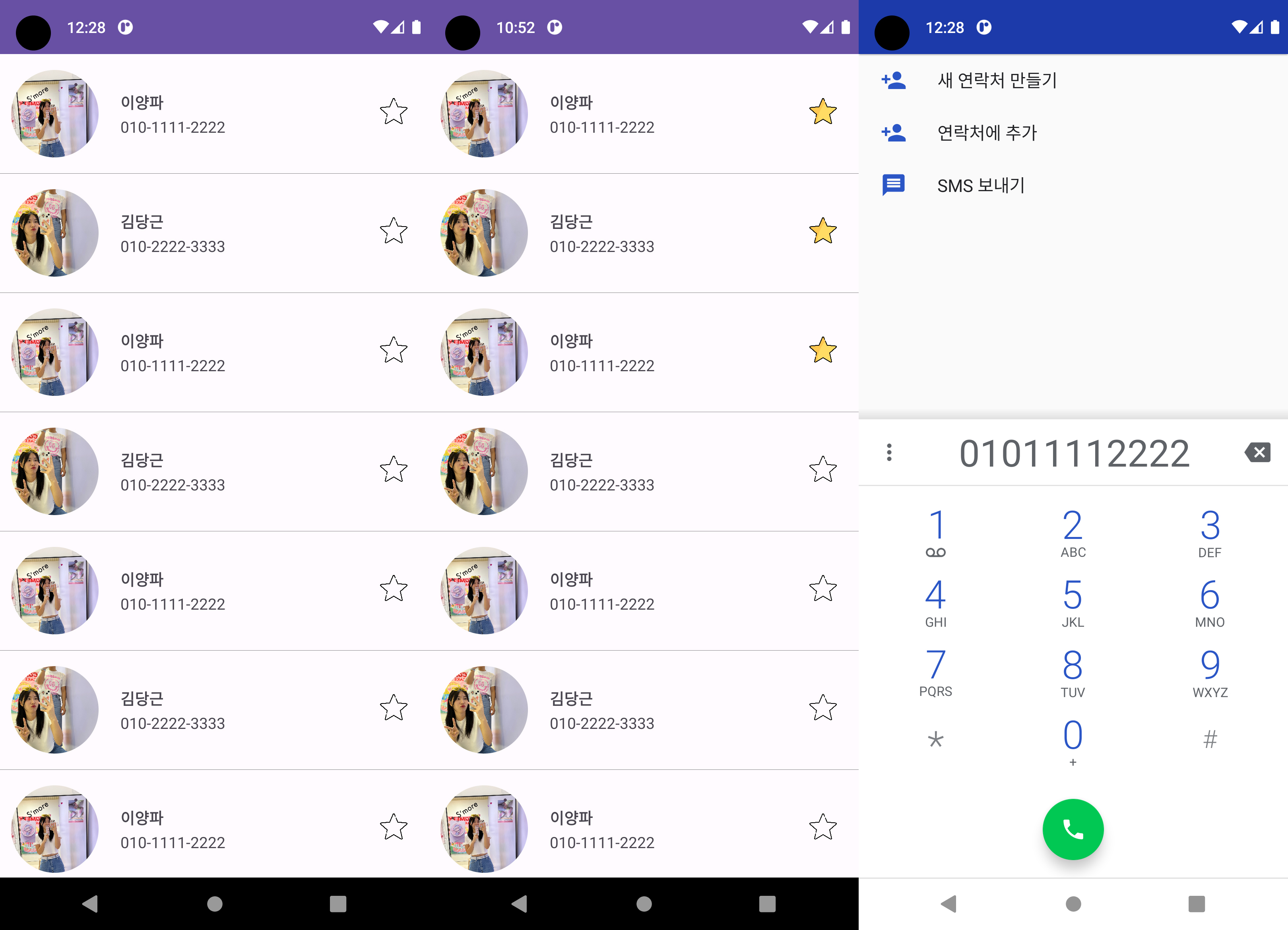 RecyclerView를 사용하여 리스트를 표시하고, 각 아이템의 클릭 기능을 구현했습니다. (별 아이콘 클릭 시 즐겨찾기 토글, 전화번호 클릭 시 해당 번호로 전화발신) RecyclerView는 많은 아이템을 효율적으로 관리하고 표시할 수 있으며, ViewBinding을 활용하여 UI 요소에도 접근할 수 있습니다.