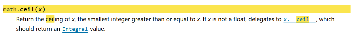- 무조건 올림을 해서 큰 것들 중 가장 가까운 정수를 반환한다.