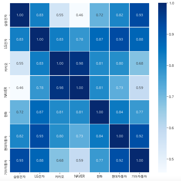 companies = ['삼성전자', 'LG전자', '카카오', 'NAVER', 'CJ', '한화', '현대자동차', '기아자동차']