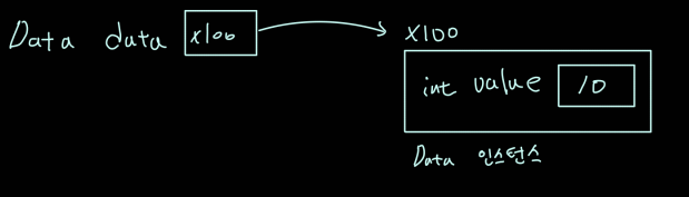 참조변수 data 안에 x100 이라는 주소가 대입되었고 주소값이 x100 인 Data 인스턴스에 접근하여 멤버변수 value 에 10 을 대입할 수 있게 되었다.