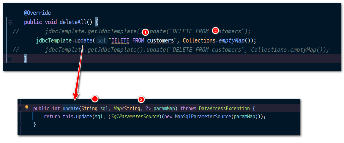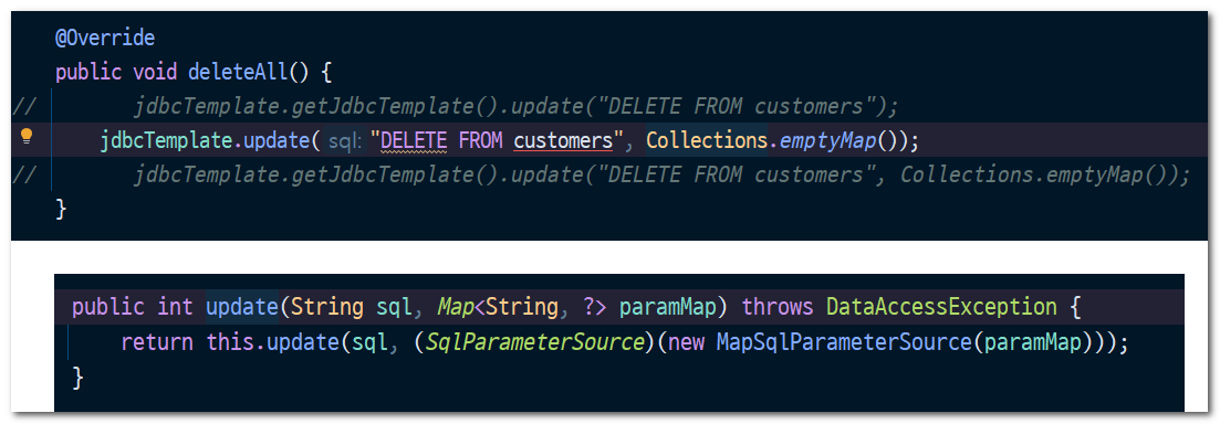 jdbcTemplate.update("DELETE FROM customers", Collections.emptyMap()); // 정상 작동