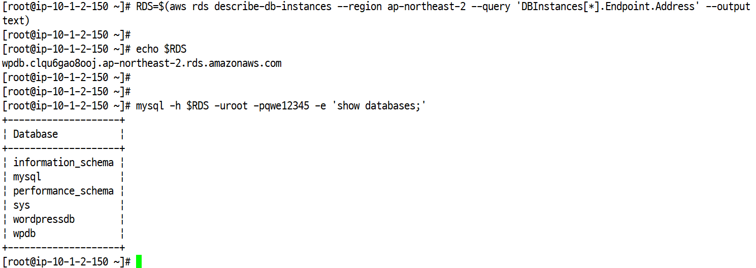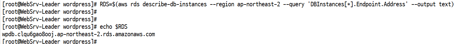 #RDS=$(aws rds describe-db-instances --region ap-northeast-2 --query 'DBInstances[*].Endpoint.Address' --output text)