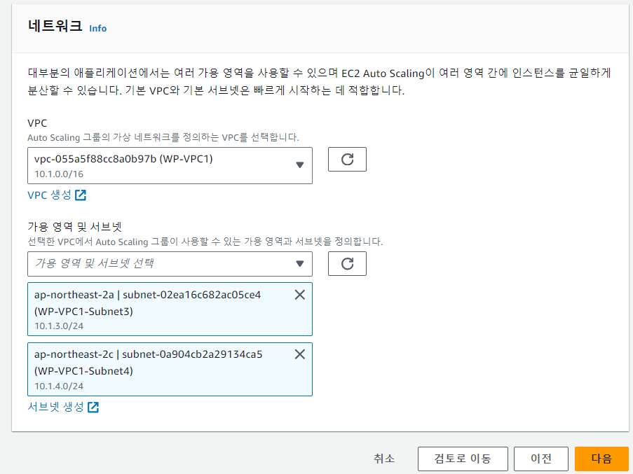 - VPC 지정 후 가용 영역 선택 ( 숫자 낮은 걸로 )