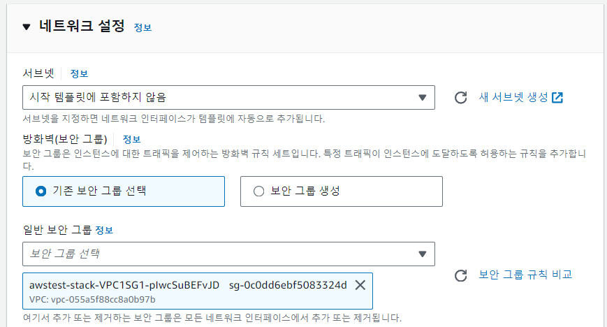 - 스택에서 만들어진 보안 그룹 선택( 서브넷은 자동 선택 )