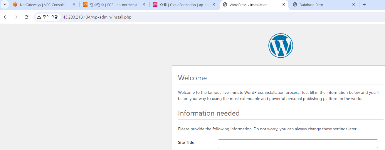 #sed -i "s/password_here/test1234/g" wordpress/wp-config.php- 수정 후 퍼블릭 ip로 접속