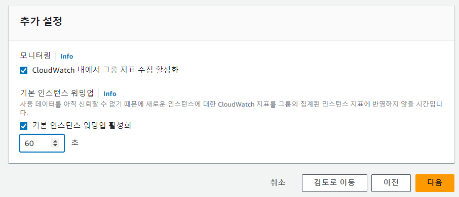 - 추가 설정 ( 모니터링, 인스턴스 워밍업 활성화 설정 )