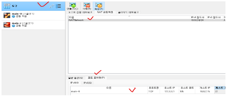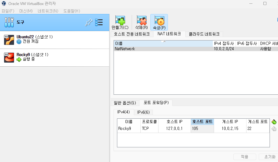 - 포트 포워딩을 통해 호스트 IP와 호스트 포트 추가( 호스트 포트와 IP는 ssh에 접속할 때 사용 )