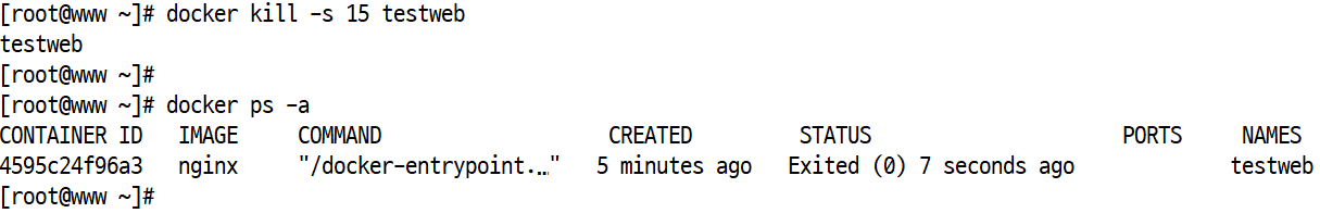 docker kill -s 15 testweb -> 15은 stop 명령어와 동일 ⇒ Exited(0)