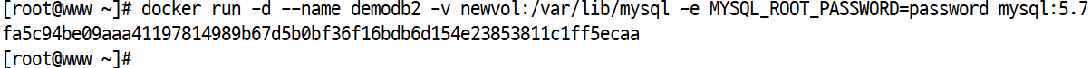 - MySQL 5.7 이미지를 사용하여 "newvol"이라는 볼륨을 사용하여 데이터를 영구적으로 저장하는 "demodb1"이라는 이름의 컨테이너 생성