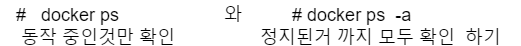 - docker ps -a ( stop 되어 있는 컨테이너도 보여준다, 삭제 후 이미지 삭제 가능 )
