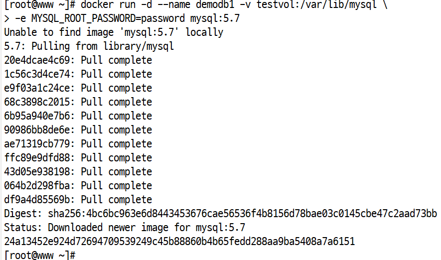 - MySQL 5.7 이미지를 사용하여 "testvol"이라는 볼륨을 사용하여 데이터를 영구적으로 저장하는 "demodb1"이라는 이름의 컨테이너 생성