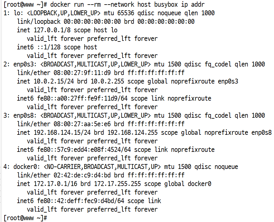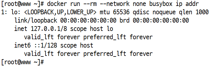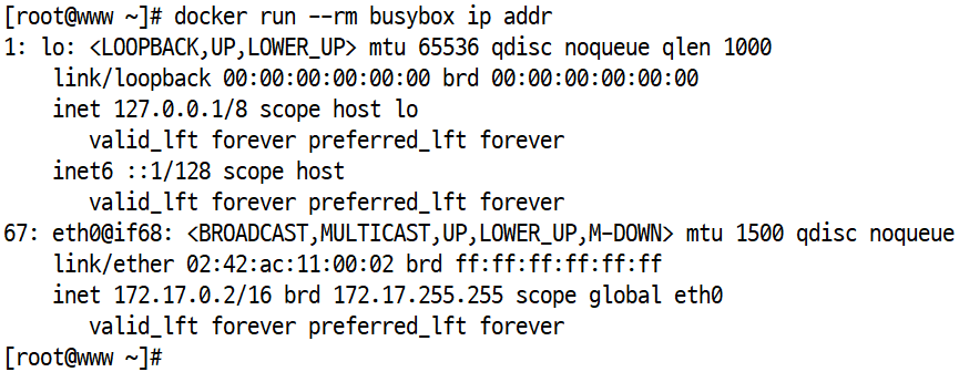 - busybox 컨테이너는 네트워크를 가지지 않은 상태로 실행 ( 지우고 만들기, 네트워크 인터페이스와 IP 주소 정보가 표시되지 않을 것 )