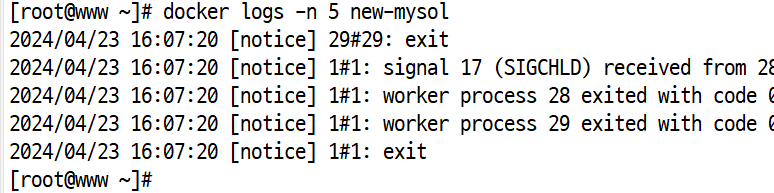 - 컨테이너 로그 확인 ( docker logs, -n 옵션은 줄 갯수 )