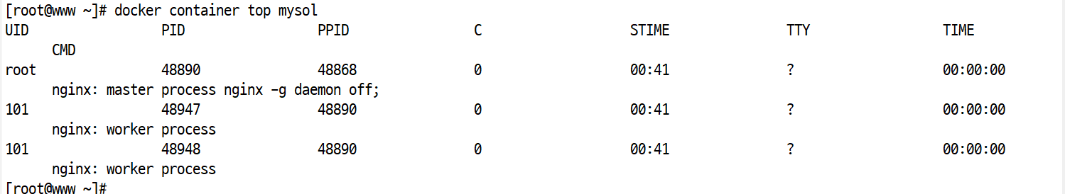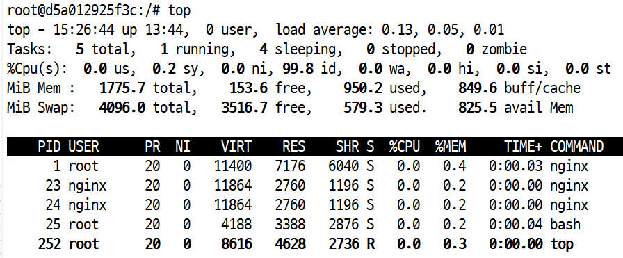 - top 명령어를 통해 컨테이너 확인 ( aux옵션 : 전체로 보여주는 것 )