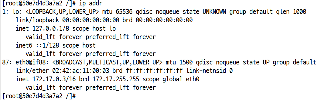 - busybox이미지를 이용하여 컨테이너 내의 네트워크 인터페이스와 IP 주소 정보를 보여줌 ( 기본 )