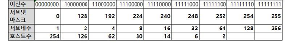 - C 클래스 호스트 주소 사용 개수 2^n-2=256-2=254