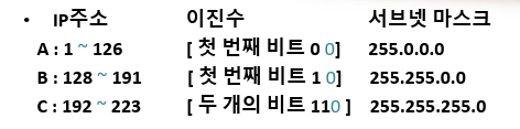 - 255.255.255(네트워크 주소)/2진수:0~255(호스트 주소)
