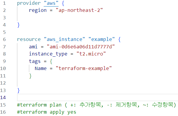 resource : 구성 요소를 지정 ( ami,instance_type,포트등) resource는 여러개로 구분 가능함.