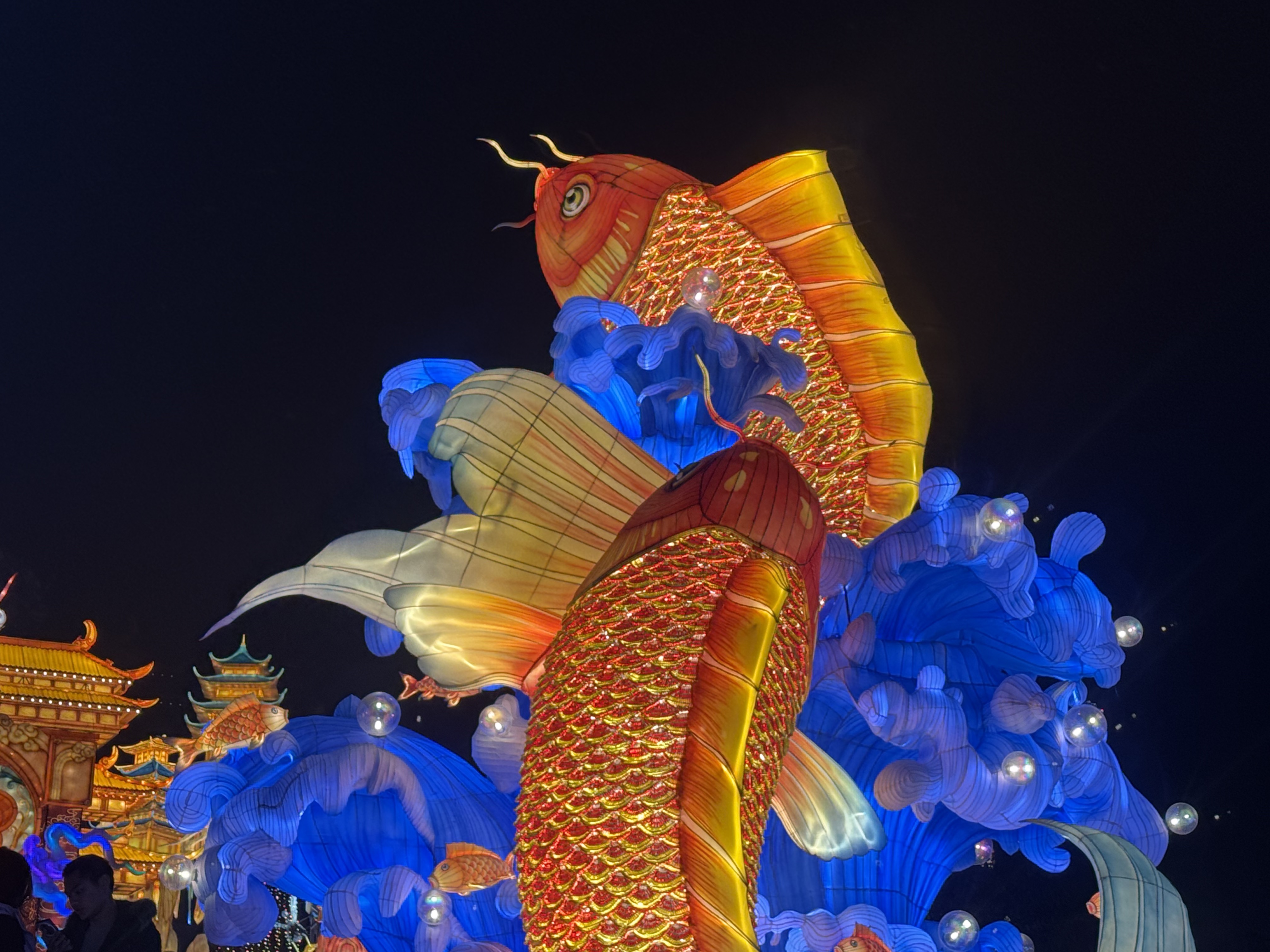 핵심 전시 구역의 "천마행공(天馬行空)" 등불 조형물은 이번 축제의 주요 볼거리입니다. 2026년 말띠 해를 상징하며 《산해경》 속 '천마(天馬)'의 신화적 이미지를 융합했습니다. 22미터 높이의 주등(主灯)인 "팔준분등(八駿奔騰, 여덟 마리 준마가 질주하다)"은 쯔궁 무형문화재인 '자기 묶기(瓷器捆扎)' 기법을 사용하여, 약 10만 개의 청화백자 조각을 수작업으로 이어 붙였습니다. 밤에 불이 켜지면 자기 조각들이 유리처럼 점층적인 광택을 반사합니다.