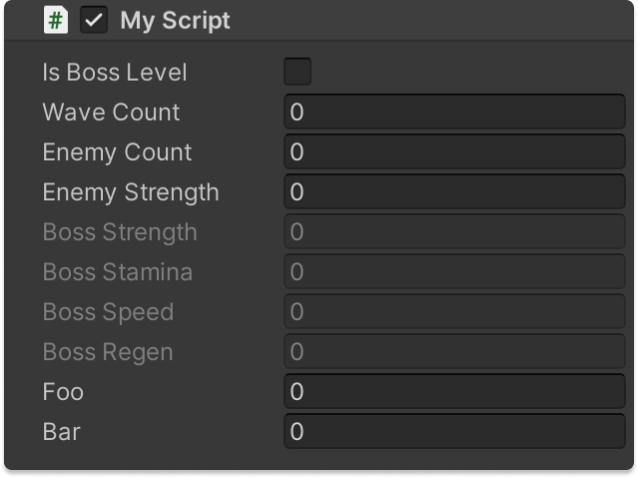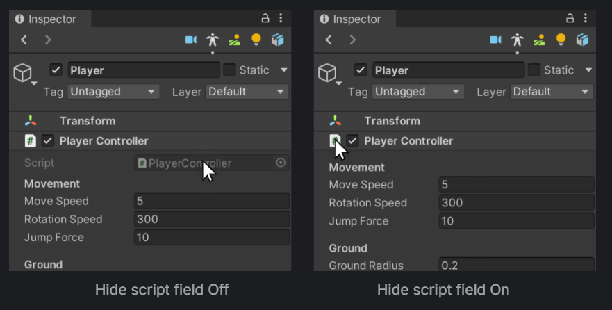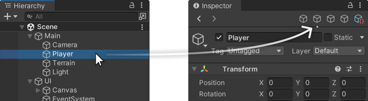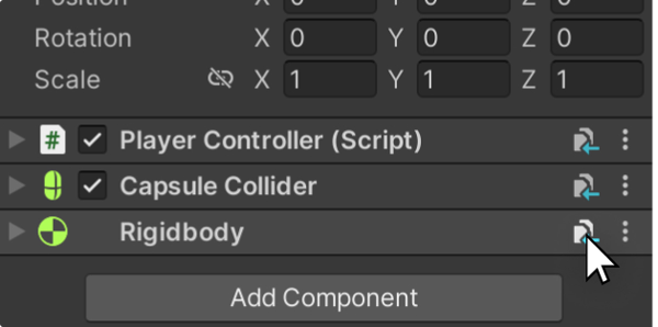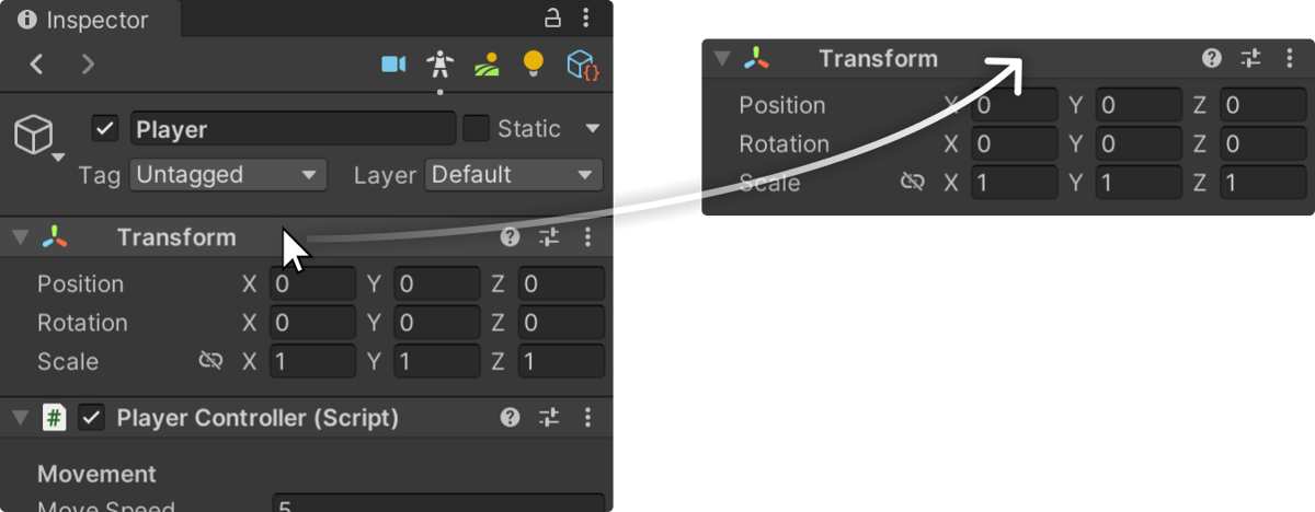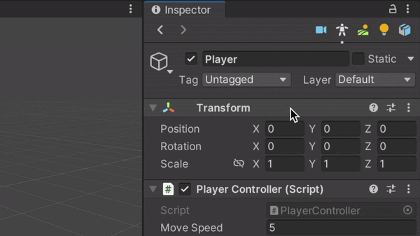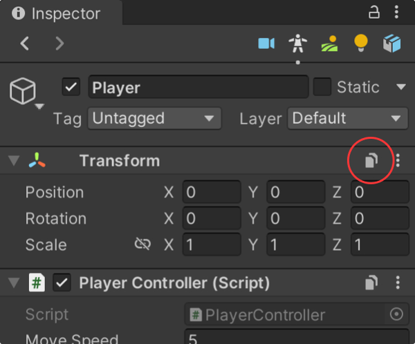 인스펙터의 변수값을 초기값으로 돌릴 수 있는 버튼이 있다. 딱히 쓸모 있어 보이지 않지만, 나중에 소개할 Attributes 챕터와 연계해서 쓰면 아주 유용할 것 같다.