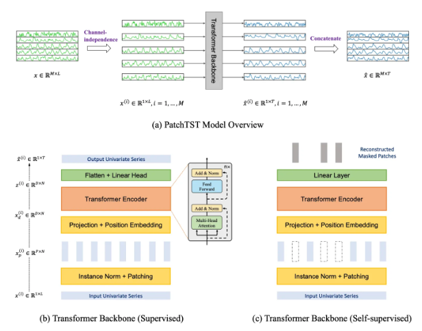 입력은 M개의 단일 변수 시계열 로 분리되며, 각각의 시계열이 transformer backbone(Encoder)으로 독립적으로 전달됨