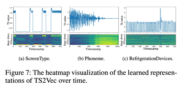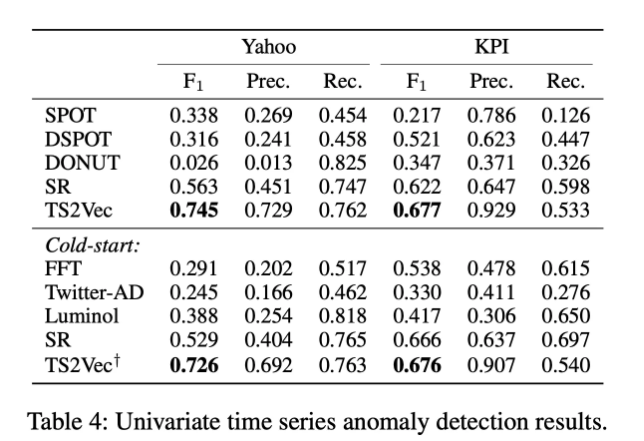 TS2Vec으로 학습된 표현을 평가하기 위해 시계열 분류, 예측, 이상 탐지 작업에 대해 실험 결과를 제공한다.