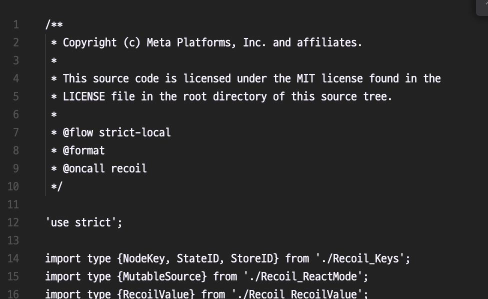 Recoil의 라이브러리 내부를 보면 core폴더에 Recoil_RecoilRoot.js.flow파일이 존재한다. 이 파일이 RecoilRoot가 선언된 파일이다. 여기서 어떻게 createContext를 사용하는지 살펴보자.(굳이 볼 필요는 없는데 개인적인 궁금증..)