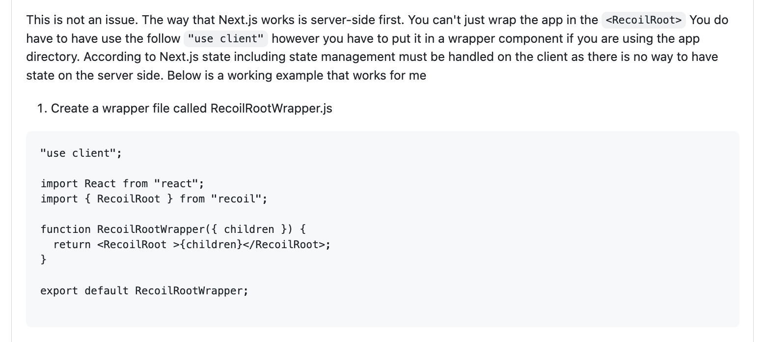모든 상태관리 라이브러리에 'use client' directive가 있는 것은 아니다. 따라서 Recoil이 아닌 다른 라이브러리를 사용한다고 하더라도 context를 클라이언트 컴포넌트에 감싸서 사용해야할 수 있다.