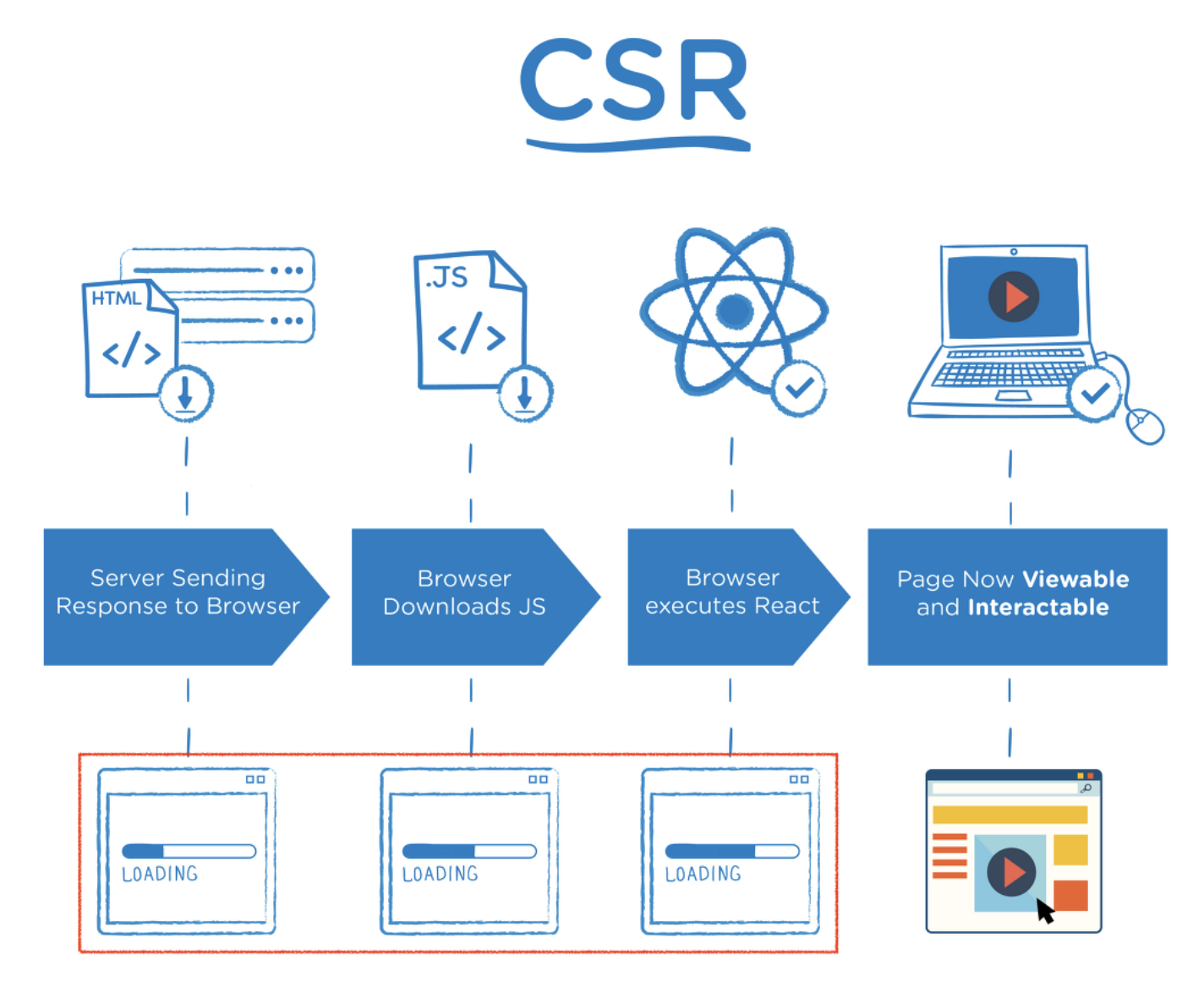빈 html과 모든 로직이 담겨있는 js파일을 받는다. 클라이언트는 이렇게 받은 html에 js로 DOM을 동적으로 생성해 화면을 그려낸다. 이런 과정을 클라이언트 쪽에서 진행하기 때문에 CSR이라는 이름이 붙게 됐다.