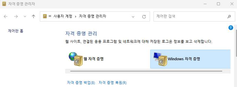 제어판 - 자격 증명 관리자 -window자격증명 에서
