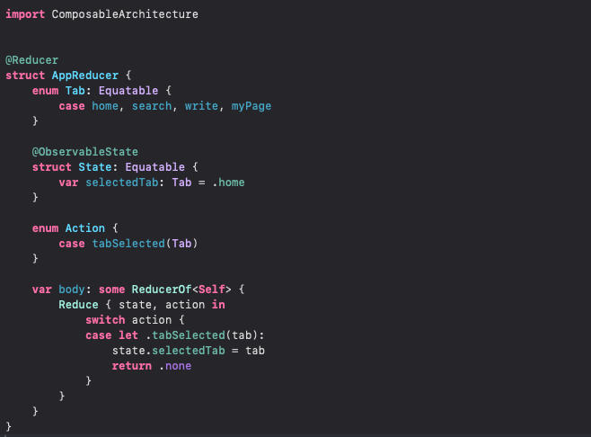 TCA에서 앱은 하나의 상태 트리로 관리되고, AppReducer가 그 트리의 최상단이다.