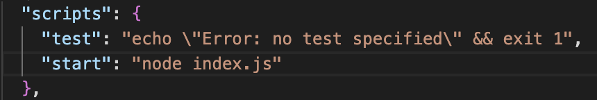 해결방법은 간단하다. packge.json 파일을 연다. 그럼 다음에 script 안에 npm start 설정한다.