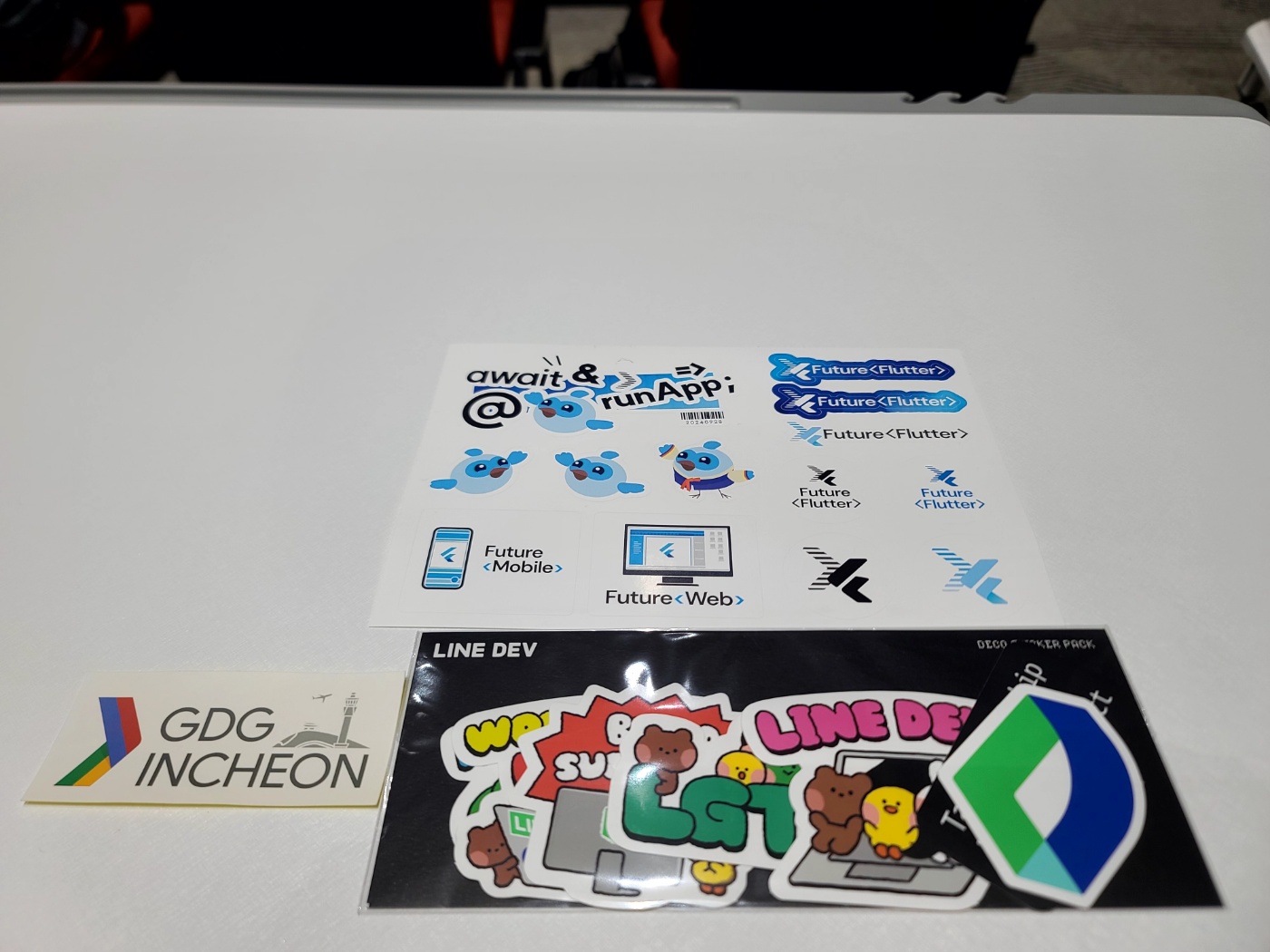 행사장은 2층에 있었고 귀여운 플러터/라인 스티커를 받았습니다.