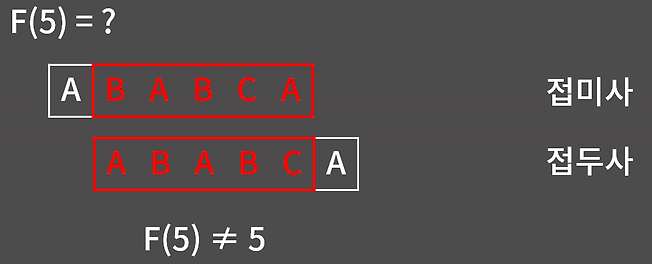 - 접미사 BCA와 접두사 ABA -> 다름 F(5) != 3