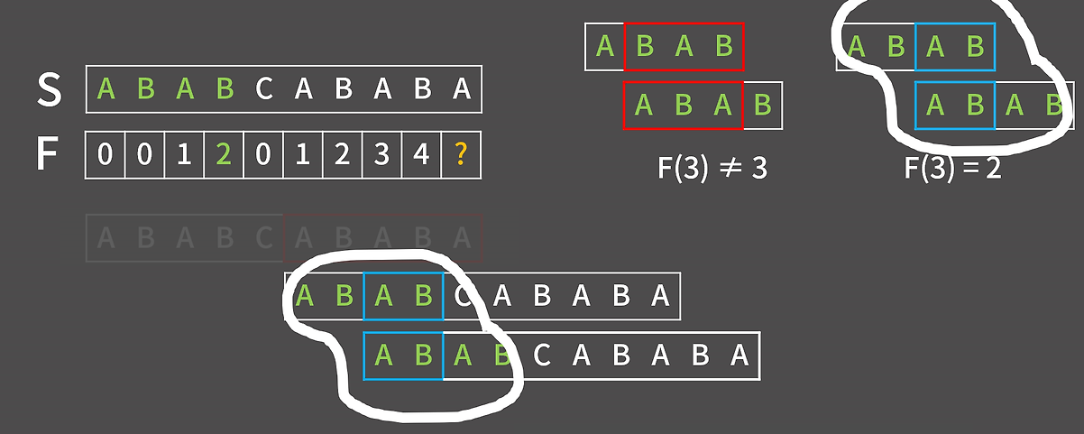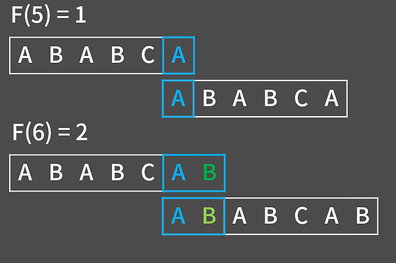 - 접미사 ABCA 와 접두사 ABAB -> 다름 F(5) != 4