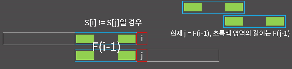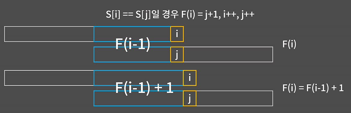 위 그림을 보면 F(6) = 2인데 전에 F(5)=1인 성질을 이용하여 구할 수 있다. F(5)가 1이므로 F(6)의 경우 접미사의 추가된 문자와 접두사를 F(5)에서 한 칸 뒤로 민 문자의 값과 동일한지만 비교하면 된다. 따라서 접미사의 추가된 문자와 현재 접두사의 다음 칸 문자가 동일하다면 F(N) = F(N-1)+1로 설정이 가능하다.
